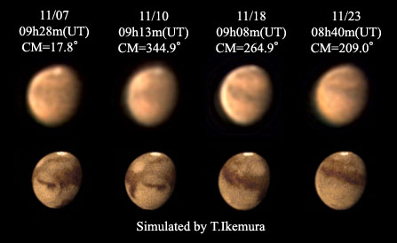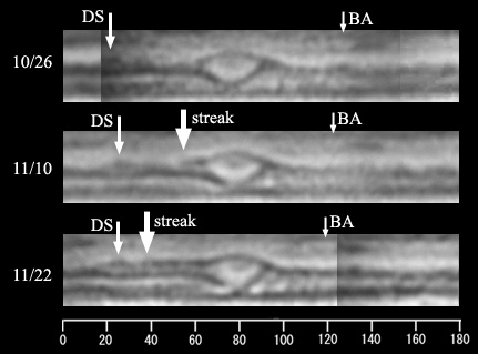 11月に入って写真2に示すようにGRS(大赤斑)前方に大きな変化が観測されました。11月7日UTに池村氏、伊藤氏、永長氏の画像で、GRSからSTrZ(南熱帯)前方に12°ほど伸びるdark streak(前端II=54°)の発生をとらえました。先月号で紹介したように、10月10日UT頃からGRSの南側を取り巻く暗いアーチ構造が見られ、さらにGRS直後の暗部が濃くなってきたことから、STrZのstreakの発生が予想されていました。streakは14日UTまではほぼ長さは変わりませんでしたが、その後急速に前進し、24日UTには前端がII=35°、長さは30°に達しています。ドリフトは-40°/月を示しており、このままstreakはさらに前方に伸びるのではないかと思われます。近年の観測では、STrZのstreakは1998年8月と2000年7月に発生しており、どちらも3ヶ月間で100°の長さに発達し、前端部はSTB(南温帯縞)に合流しました。