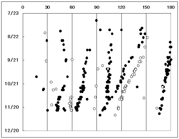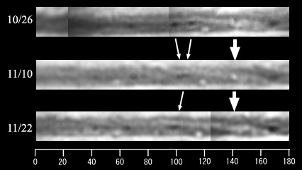 写真3と図4に示すように、このNEBのbarge同士の合体という珍しい現象が見られました。9月からII=150°のbargeの前進が加速され、その前方のII=115°のbargeに急速に接近していましたが、11月15日UT頃に一つのbargeに合体してしまいました。合体後は後方のbargeの前進速度を保っていて、やや大きくなっているようです。