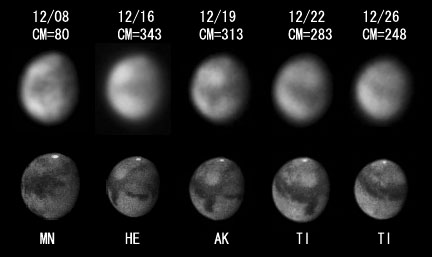 NEB(北赤道縞)は現在拡幅期にあり、NTrZ(北熱帯)に広がった幅のあるベルトになっています。NEB南縁に見られるfestoonはあまり目立たず、NEB中央部に赤茶色の暗斑bargeが7個、その間のNEB北縁には7個の白斑が見られます(図3、図4)。11月中旬に2個のbargeが合体しましたが、その後も一つのbargeとして観測されています。bargeの存在している緯度が本来のNEBn(北組織)で、12月には、bargeをつなぐように中央部のベルトが目立ってきました。このベルトの北側のII=320〜0°の領域は淡化しつつあり、今後は北半分の淡化が全周に広がるでしょう。