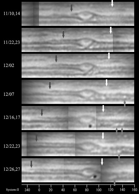 もう一つの現象は、12月7日UTにGRSの後方II=142.6°に発生したSEB(南赤道縞)内の白斑の活動です。その後、12月15日UTにはその前方のII=133.5°にも別な白斑が発生し、GRSに向かって広がっていき、12月末にはII=90〜135°の領域は定常的なGRS後方撹乱となりました。このSEBの白斑の活動領域の後端部は、-30.0°/月のドリフトでゆっくりと前進しています。SEB内に白斑が急速に広がっていく現象としては、1998年に観測されたmid-SEB outbreakが考えられますが、今回の現象はGRSに近いことから異なるものと思われます。