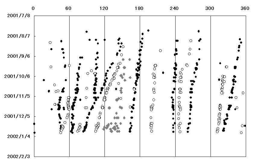 図4 NEBのbargeとnotchのドリフト ●がbarge、〇がnotchを示す。◆はNEBの白斑。(拡大) |