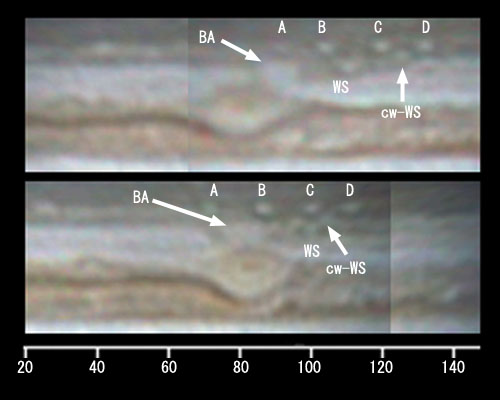 この'BA'の約20°後方のSTB南側に小さな白斑(WS)があります。また、SSTB(南南温帯縞)には4個の小白斑(A,B,C,D)があります。SSTB白斑同士の距離は接近しつつありましたが、後方のCとDの白斑の間に時計回りの小白斑(cw-WS)ができました。STB白斑のBC-DEのマージやBE-FAのマージの時にも、白斑同士が接近した際に、接近を食い止めるかのように逆回りの渦が形成されました。そして、この逆回りの渦が消えた後は速やかに2つの白斑のマージが起こりました。同様なことがSSTB白斑C-Dの間でも起こるのではないかと思われます。