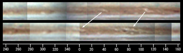 2002年1月19日UTに新しい白斑がII=73.4°に発生すると、この白斑は早い前進を示し、前方にあったNEBnの2つのバージを追い越していきました。白斑と同じ緯度にあったバージは、1月末(B)と2月上旬(C)には一気に消失してしまいました。また、この白斑を起点とするriftは2月末にはII=220〜0°までに成長しています(写真3)。同時に、昨年の活動領域であるII=120°付近にも、新しい白斑が次々に発生して、別なriftを形成しています。NEBの北半分は明化が進行していて、本来のNEBの幅に戻りつつあります。