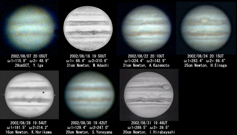 7月20日に合を終えた木星の最初の観測は、合の18日後の8月6日UTで、筆者の眼視スケッチでした。翌7日(以降日時はUT)には高度11°という低空にもかかわらずCCD画像を得ることができました。8日には堀川邦昭氏(横浜市)、16日には永長英夫氏(兵庫県)・安達誠氏(滋賀県)、22日には風本明氏(京都市)と観測者が増えていきました。8月に報告のあった7名の観測を写真1で紹介します。日の出時の高度が20°を超えた21日以降は、CCDでもクオリティが上がってきています。8月後半は台風の影響もありましたが、やはりどっかりとした太平洋高気圧のおかげで、シーズン初めだというのに、2枚の展開図を作成することができました(写真2)。2001-02年のシーズンの最終観測は6月3日で、2ヶ月ほどの観測の空白期間での変化を追いかけるのがシーズン初期のテーマです。