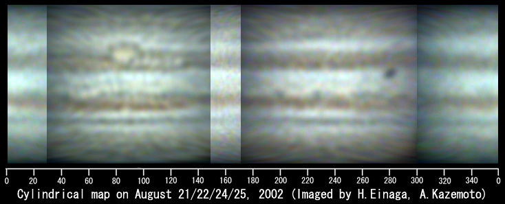 写真2 2002年8月21/22/24/25日の観測からの木星展開図 撮影/永長英夫(兵庫県、25cmニュートン、NEC PICONA)、 風本明(京都市、31cmニュートン、NEC PICONA)(拡大) |