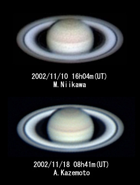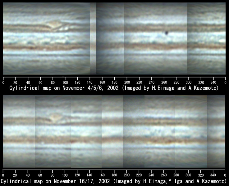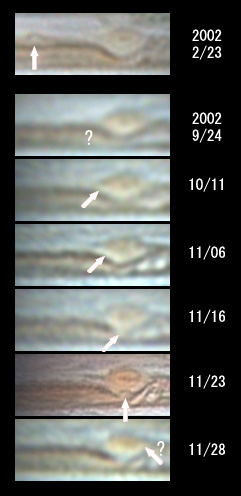 2002年11月28日にBAAのJ.H.Rogers氏からメールが届き、『STrZ(南熱帯)の白斑が大赤斑と合体している、しかも今も現象は進行している』とありました。この白斑とは、2001年10月頃に出現し、ドーナツ型をしていて、SEBs jetstreamに乗ってゆっくりと後退していたものです。そして、2001年11月に発生したSTrZのダークストリークが白斑を通過したにもかかわらず、2002年4月まで追跡できていました。その後退速度から2002年秋には大赤斑との会合を予想していましたが、これまでの観測では何も見つかっていませんでした。