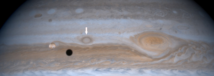 また、2000年12月に土星探査機カッシーニが木星通過時に撮影した同様なSTrZ白斑を図2に示します。この時は2001年3月に大赤斑と会合しましたが、太陽との合が近くて詳しい観測は得られませんでした。