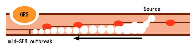 図1に示すように、12月14日UTに発生した白斑は輝きを増し、SEBnに潜り込むように前進しました。画像からではEZs(赤道帯南組織)に吹き出しているようです。12月23日UTにはさらに発生源から新しい白斑が供給されました。2003年1月に入ると、4日UT、20日UT、28日UTと、ほぼ10日周期で新しい白斑が供給されています。これらは特徴的なmid-SEB outbreakの現象ですが、第1次の白斑の活動ほど輝度のないものでした。1998年3月に発生した同現象の模式図を図2に示しますが、前回はII=350°が発生源で、大赤斑後方までの経度差が240°もあり、半年間の活動期間と合わせて過去最大クラスのものでした。今回の出現は大赤斑後方での発生であり、大赤斑後方の擾乱領域がどのように影響を受けるのか注目しています。