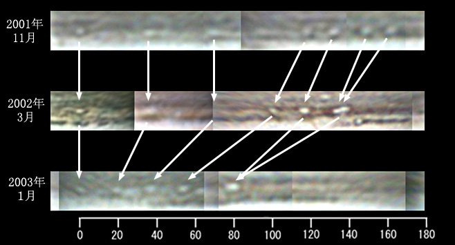 SSTB(南南温帯縞)には5個の小白斑が見られますが、1月にはちょうど大赤斑の南側に位置しています。最近のSSTB白斑の動きを図4にまとめてみました。2001年11月頃には7個の小白斑が、経度165°の範囲に分布していました。後方の4個の小白斑はかなり接近していましたが、最も後方の2個の小白斑はさらに接近し、2002年3月にマージ(合体)し、一つの白斑になりました。中段の画像はマージ直前のもので、お互いの白斑が左回りに回転をしている様子が見られます。