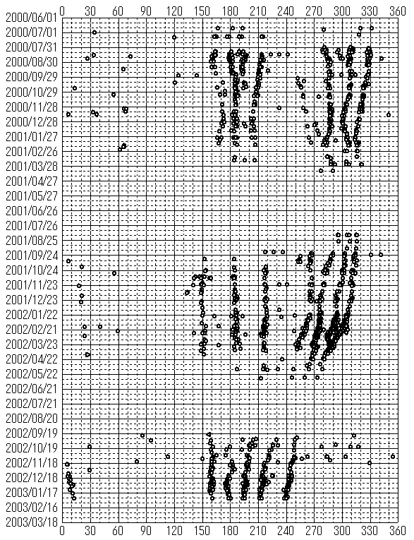 今シーズンの初めの2002年10月には、SSTB白斑は5個になり、さらに経度が90°の範囲に狭まっていました。合の間に後方の2個の小白斑のマージが起こったのではないかと思われます。図5は、9時間55分05秒という特殊な経度でプロットしたSSTB白斑の動きです。後方の白斑が前進速度を速めて、白斑間の距離が短くなっていることが分かります。また、これらの白斑は、意外に経度がふらついているものです。