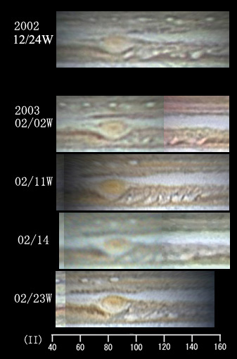 2002年12月中旬にmid-SEB outbreak(南赤道縞中央の白斑突発現象)がII=143°で発生しました。発生源に生まれた輝く白斑はSEB内を急速に前進します。また、発生源では連続して白斑が供給されます。今回の発生源はGRS(大赤斑)のすぐ後方にあり、定常的な擾乱領域と活動が区切られている必要があります。最初のoutbreak発生から、12月に2次の白斑が発生し、さらに1月に3回の発生が見られました。2月にも明るくはありませんが、発生源から白斑の発生があったようですが、次第に擾乱領域の活動と区別が難しくなってきました(図1)。