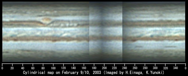 1989年から14年ぶりにNTB(北温帯縞)が淡化したためか、北半球には見える模様が少なくなってきました。2月末で、II=240-250°とII=310-330°に細い暗部(bar)が見られます。この2個の暗部の動きは、平均的な第II系に対してかなり高速に前進しており(-45°/月)、北温帯流-Bと呼ぶ約9時間54分40秒の自転周期を持っています。