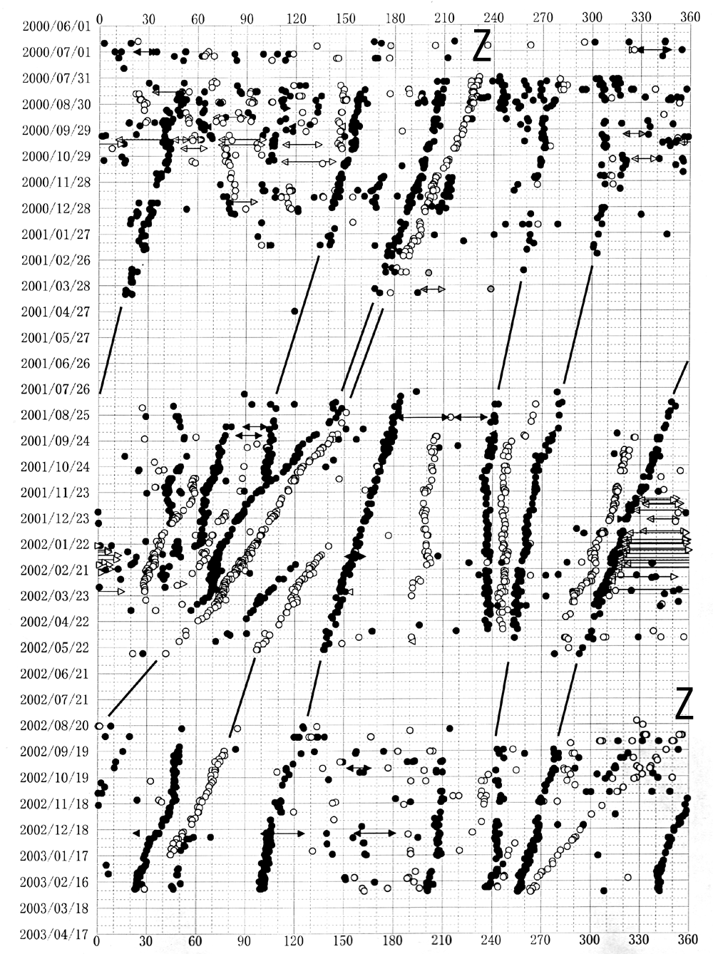 NEB(北赤道縞)は比較的全体が一様な、赤味のあるベルトです。NEB南縁には青暗いフェストーン(festoon)が数多くあり、2月には時々丸い形状をしたfestoonも出現しました。NEB北縁には、6個の赤茶色のバージ(barge)がII=20,100,200,235,255,340°にありました。図3は過去3シーズンのNEB北縁のバージを黒丸で、NTrZ(北熱帯)の白斑を白丸でプロットしています。図中に'Z'と示しているNTrZ白斑は、寿命が長いことと、他の模様に比べて前進速度が速い特徴を持っていますが、過去に前進する際にNEB北縁のバージを食いつぶして消失させています。この'Z'白斑がII=260°に位置し、まさにその前方のバージに接近しています。これから短期間の間に、バージが次第に見えなくなるかもしれません。