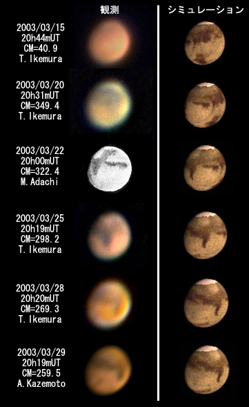 このあと、火星の季節は春になり南極冠が次第に融けて小さくなっていく様子が見られることでしょう。また、2001年の大黄雲の影響を受け、新しい模様が出現しているのではないかと期待される、南半球のダエダリアの様子もはっきりすることでしょう。視直径が大きくなってくる火星の観測はこれからますます重要になります。