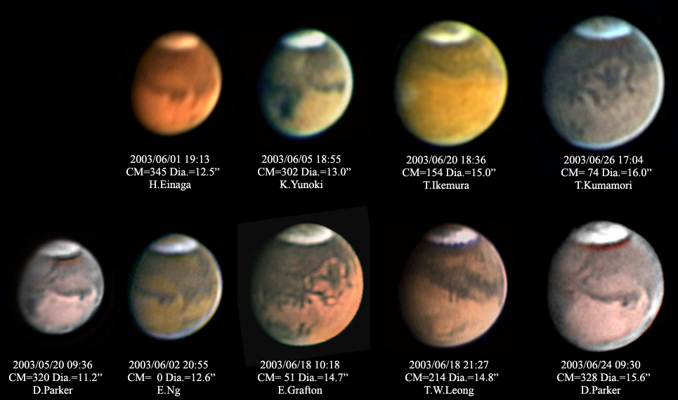 画像1 2003年6月の火星 上段は日本での観測、下段は世界の観測者の画像で南極冠内の模様に注目。 撮影/永長英夫氏(兵庫県)、柚木健吉(堺市)、池村俊彦氏(名古屋市)、熊森照明氏(堺市) D.Parker氏(米国)、E.Ng氏(香港)、E.Grafton氏(米国)、T.W.Leong氏(シンガポール)(拡大) |