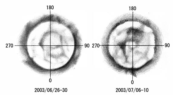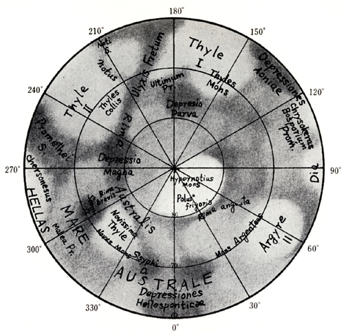 6月の観測を集約すると、南極冠内部の薄暗い部分は、しだいに筋のようになり、どうやら南極冠が縮小する際にいつも観測される割れ目へと進行するようです。6月下旬と7月上旬の観測から、南極冠の真上から見た図を作成しましたが(図2)、南極冠の暗い領域が筋状になっていることが分かります。これは、E.M.アントニアジ(フランス・ムードン天文台)が1930年に出版した「惑星・火星」で示した南極付近の模様(図3)と良く一致しています。