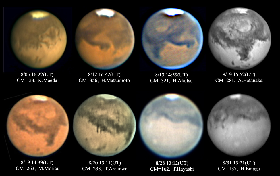 画像1は、特集記事で取り上げることができなかった観測者の8月の画像を日付順に並べてあります。これらの観測は、25cm〜40cmの望遠鏡と今年ブームになったToUcam Proの組み合わせで撮影されたものですが、森田光治氏(滋賀県)だけは20cmとデジカメPICONAで撮影されています。7月29日にクリセに発生した黄雲は南方に広がりましたが、8月4日頃にはおさまってしまいました。ただ、今年の火星は真っ赤な惑星ではなくて、ずっと大気中にダストが漂っているのでしょうか、模様のコントラストが低いままで、黄色の惑星の印象でした。画像処理のおかげで、画像では模様はコントラスト良く見えていますが、実際に望遠鏡で見ると模様は見えにくいものでした。