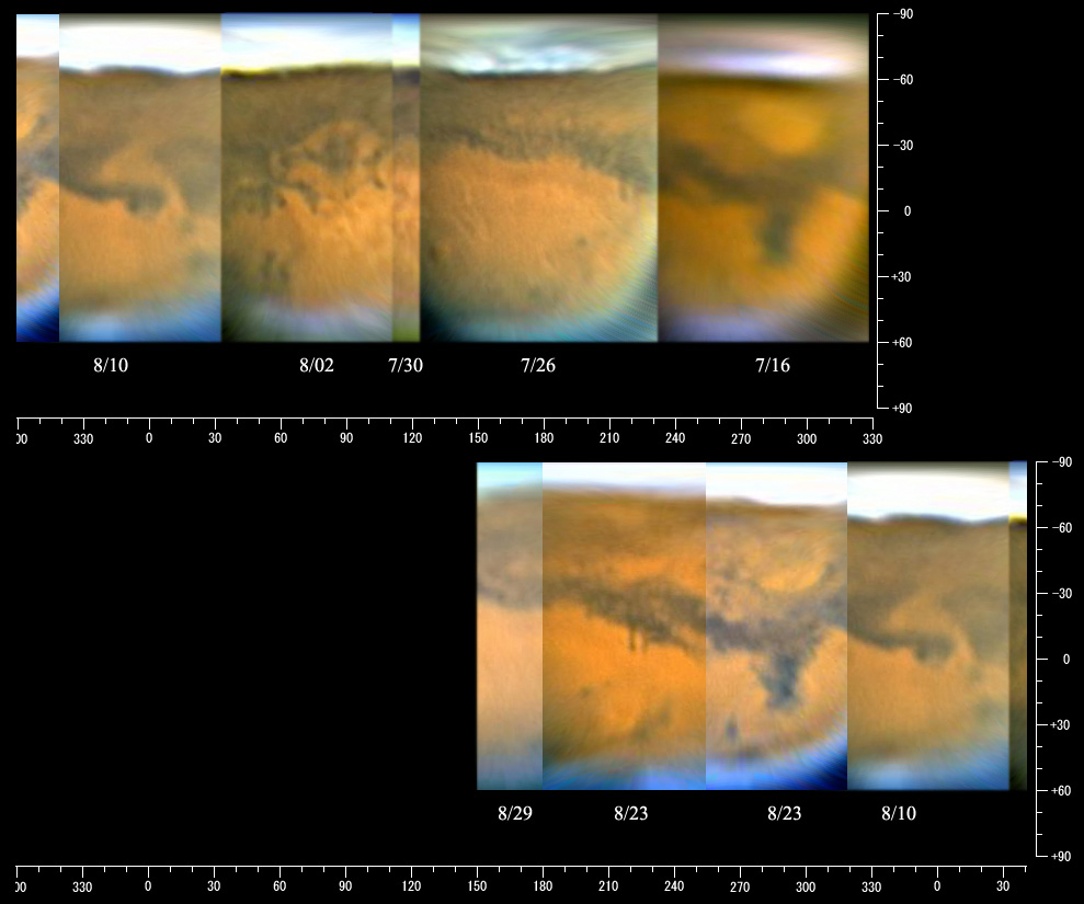 画像2は、7月16日から8月29日までに撮影された池村俊彦氏(名古屋市)の8枚の画像から作成した展開図です。この1ヵ月半の間に、模様が大きく変わったような変化はありませんでした。展開図は右から左に時間が経過しているのですが、南極冠の内部に薄暗い模様が出現し、それが大きな南極冠の割れ目に成長する様子と、8月中旬以降に急激に南極冠が縮小する様子が分かります。
