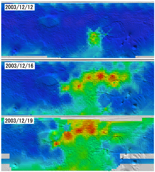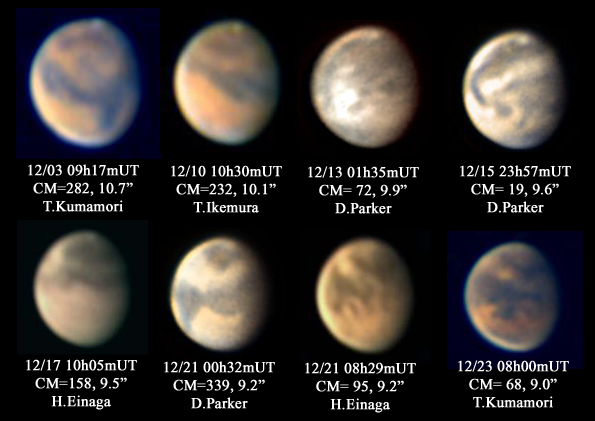 mid-SEB outbreak(南赤道縞の白斑突発現象)は、勢力を弱めているものの、その活動はまだ続いています。発生源はII=170°付近にあり、SEBへの白斑の供給が続いています。ただ、目立った明るい白斑ではなく、次第にSEB北縁に向けて幅が狭くなっています。相変わらず大赤斑後方の定常的な攪乱領域は消失したままです。過去の観測では、mid-SEB outbreakの末期には発生源からの白斑の供給が止まると、後方から数十度の長さを単位で一気に消失します。実際に今回はすでに11月に後方の25°の長さが消失しています。もう少しでmid-SEB outbreakの活動も終了するのかもしれません。