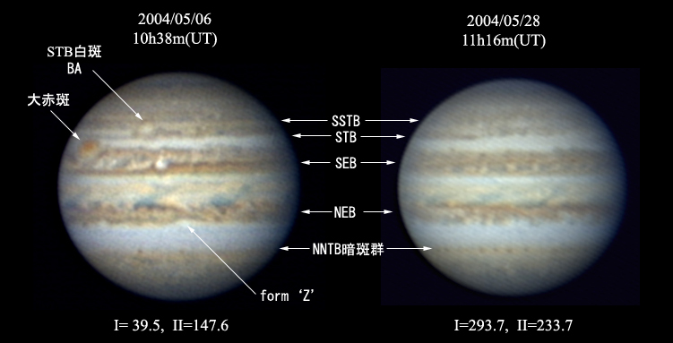GRSの南を通過したSTBs小暗斑は、4月21日に永長氏の画像でII=60.4°に確認されましたが、その後消失しました。この小暗斑は2002年12月初めに出現したもので、最初は丸く濃い暗斑でしたが、2004年2月にGRSの南を通過すると、次第に横長となり、大きさが縮小していたものです。消失した経度はGRSの前方35°付近で、STBの緯度の模様はしばしばこの経度で分裂することが観測されていました。