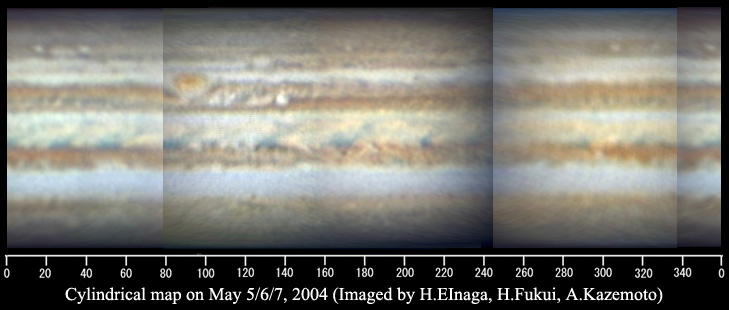画像2 2004年5月の木星展開図 撮影/永長英夫、福井英人氏(静岡県、25cm反射)、風本 明(京都市、31cm反射)(拡大) |