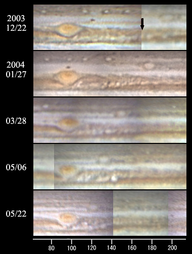BAの後方は、II=230°までの長さ100°ほどの経度でSTBが復活しています。昨シーズンは、BA直後に長さ10°ほどの暗部と、100°ほど後方に長さ60°ほどのベルトがありました。後方のベルトの自転周期が速いために、2003年12月ごろには2つの領域の間は30°ほどに狭まり、2004年1月にはその間の領域も暗化して、一体としたベルトになってしまいました。BAのGRS通過によって、この領域も変化が予想されます。