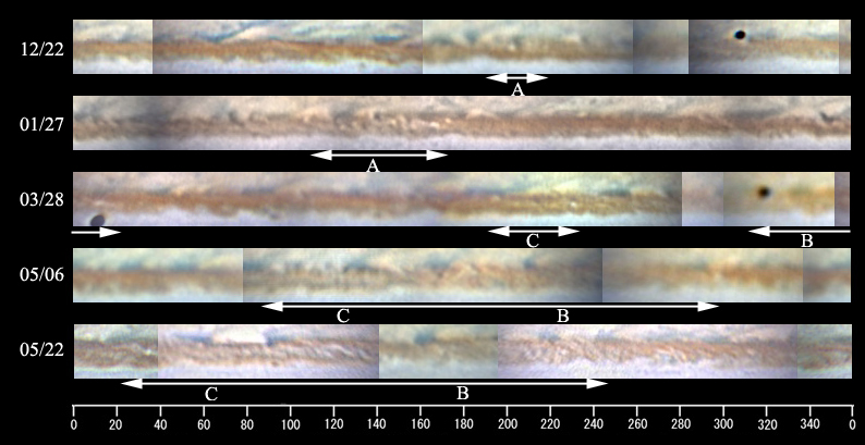 NEB(北赤道縞)には内部を斜めに横切る白いrift(リフト)構造が数多く見られます。riftは、NEB中央に明るい白斑が発生し、それが東西に引き伸ばされてできる現象です。画像4にNEBの様子を示しますが、12月下旬にII=210°付近の領域Aに白斑とriftが出現したのが始まりです。この白斑とriftはI系とII系の中間の自転周期9h54m15sを持っているために、画像4では左に速く移動すると同時に、活動領域が経度方向に広がります。こうして、最初の領域Aは1月下旬にはII=110-170°に拡張しました。3月には別な活動領域BとCが出現し、5月にはこの2つの領域はつながって大きなrift領域を形成しています。5月下旬にはII=20-250°の広い範囲がrift領域になっています。