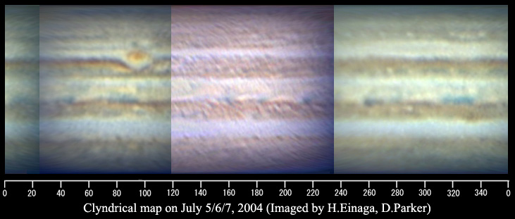 画像2 2004年7月の木星展開図 撮影/永長英夫(兵庫県、25cm反射)、D.Parker(米国、40cm反射)(拡大) |