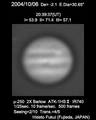 さて、画像1の福井氏の観測ですが、これはIR740による赤外域画像です。STrZの中央右に白く見えるのが大赤斑で、赤外画像では白く写ります。経度は予想されていたII=95度付近に位置しています。注目していたSEBは、ここで見られる経度では濃いベルトのままで、昨シーズンと大きな変化はないようです。とはいえ、他の経度、特に大赤斑後方の様子がわかりませんので、今後とも注意が必要です。同様に昨シーズン幅の広がったNEBにも変化はないようで、SEBとNEBの2本の太いベルトが目立ちます。大赤斑の南にSTBが濃く見えていて、さらにその前方にくびれが見えますが、これはSTB白斑'BA'です。これまでのドリフトからII=50度に予想された位置に観測されました。まだまだ低空で条件に恵まれないでしょうが、いよいよ2004-05年のシーズンが始まりました。