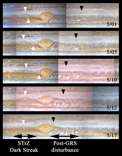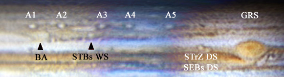 BAから前方に広がるSTBn暗斑は、9h53m44sの自転周期を持つSTBnジェット気流に属していて、ドリフトは-85°/月と非常に高速です。これらの暗斑群の多くは、BAの前方100°ぐらいに達すると消失していますが、それでも3個の暗斑だけはもっと長く残りました。図2の大赤斑まで達した暗斑は、これらの暗斑群の初期に発生したものです。