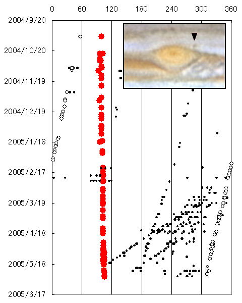 STBnジェット気流に乗ったSTBnの暗斑が高速に前進し、5月17日に大赤斑まで達しました(図2)。その後は、暗斑は大赤斑の渦に巻き込まれたのか、行方が分からなくなりました。図3にこの緯度の模様をプロットしていますが、大きな●が大赤斑を、白い○がBAを、小さな点がSTBn暗斑を示します。2月20日頃から、BAの前方に吹き出すSTBnの暗斑群が観測され、4月10日頃まで続きました。その後の暗斑の発生はなくなっていましたが、再び5月20日頃から活発になってきました。