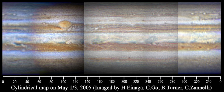 画像4 2005年5月1/3日の木星展開図 撮影/月惑星研究会関西支部(拡大) |