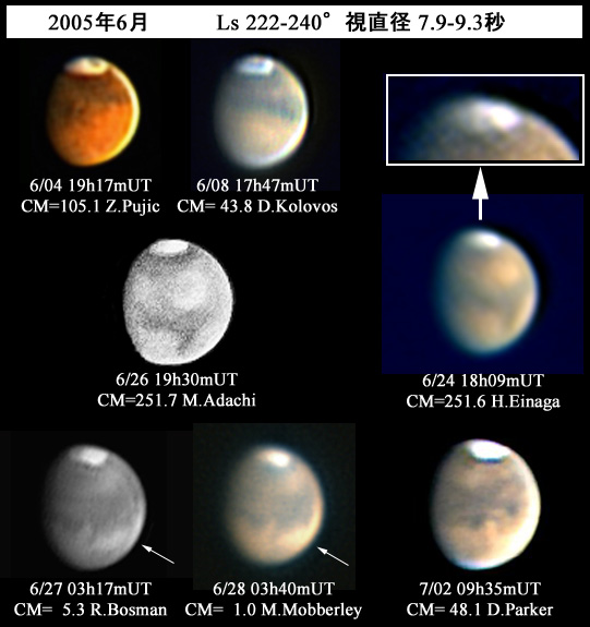 オランダのR. Bosman氏が6月27日にアウロラエ(オーロラ湾)のすぐ北に明るい斑点を見つけました。ローカルダストストームという、局部的な砂嵐の発生でした。この明斑は6月28日、イギリスのM. Mobberley氏の画像によって拡がっている姿が記録されています。残念ながら、この様子を画像の中央付近でとらえた観測がなく、状況を正確につかむことはできませんでした。7月2日にアメリカのD. Parker氏の観測で、同じ部分を観測していますが、この時には既に跡形もなく、普段の姿に戻っていました。今回のダストストームの発生は、過去の記録から見て極めて普通の時期に当たり、これからこのようなダストストームの発生が期待されます。