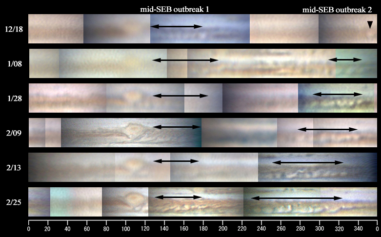 12月18日に発生したmid-SEB outbreak(SEB中央の白斑突発現象)は、今月も活発な活動を続けています(画像1)。そのため、SEB(南赤道縞)は木星面でもっとも変化の激しいベルトとして観測されています。mid-SEB outbreakは、発生源から次々と白斑が供給され、経度減少方向(左)に白斑が拡がっていく現象です。白斑と白斑の間は濃い暗部で区切られ、特徴的な様相が見られます。