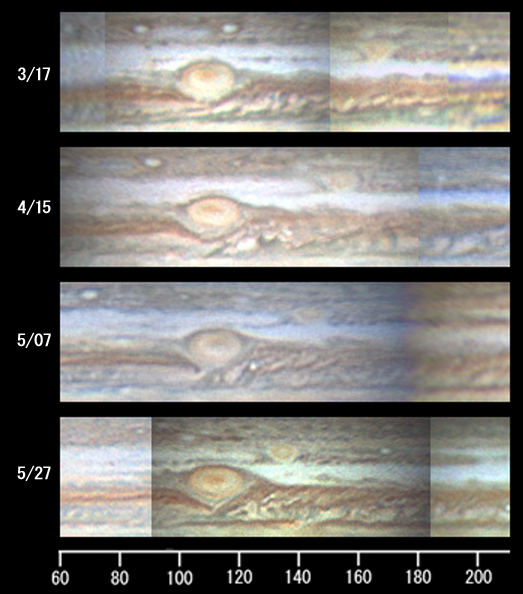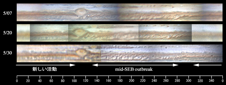 さて、今月は大赤斑前方のSEB北部にも、小さな白斑と暗柱がびっしりと並ぶ様子が観測されました。mid-SEB outbreakの前端部の白斑が大赤斑直後に達したのが4月10日頃で、大赤斑前方のSEB北部に白斑が見られるようになったのが4月末です。大赤斑前方の白斑群の前進速度はmid-SEB outbreakのものと同じです。過去には見たことがないもので、どのようにしてできたのでしょうか。