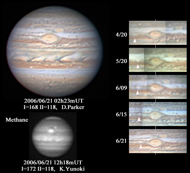 画像1 大赤斑に接近するSTB Oval "BA" 撮影/ D.Parker(アメリカ、40cm反射)、柚木健吉(堺市、20cm反射)(拡大) |