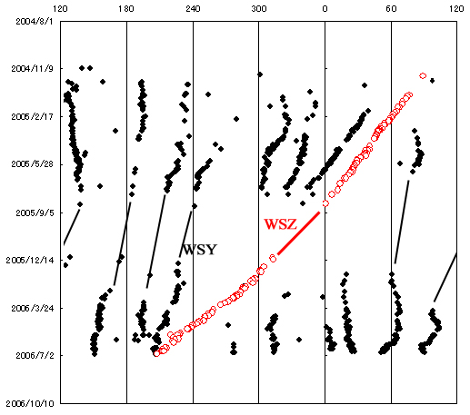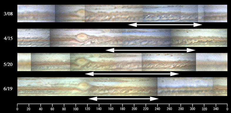 ところが、10年間のドリフト・チャートをながめてみると、白斑"Z"と同じ緯度にあるNEB北縁の他の白斑を追い越すチャンスが数回ありました。しかしながら、そのタイミングはいずれも合に近い時期で、いつの間にか白斑の数が減っていました。たとえば、画像4で、2005年7月にII=305、320、350度にあった3個の白斑は、いずれも合の間に白斑"Z"が追い越していて、合の後の観測では消失しています。