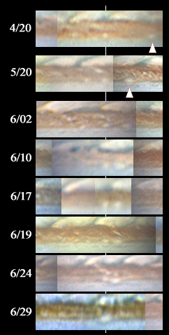 NEB(北赤道縞)北縁の長寿命な白斑"Z"が、同じ緯度にあるもう一つの白斑(BAAでは"Y"と呼ぶ)と衝突し、2つの白斑は合体(マージ)しようとしています。画像4のドリフト・チャートに示すように、白斑"Z"はその前方の白斑"Y"に急速に接近を続けていました。画像3に2つの白斑の接近の様子を示します。5月下旬に14度まで接近した後は、白斑"Z"の前進速度が少し遅くなりました。6月は2つの白斑はゆっくりと接近していましたが、24日に6度まで接近すると、白斑"Z"は北に、白斑"Y"は南に、緯度を変えています。29日には2つの白斑は合体したかのように1つに見えます。これが本当の合体かどうかは、7月の観測が明らかにしてくれるでしょう。