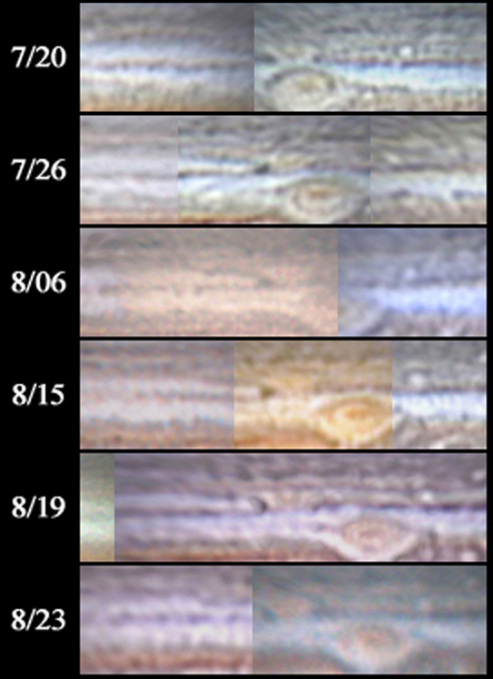 ところで、BAの後方30度に位置するSTBsの小白斑が、8月に入ると前進速度が鈍り、BAとの距離がやや広がりました。BAが加速したのかもしれませんが、この緯度の白斑にはしばしば見られる現象です。小白斑が大赤斑を通過すると、再び加速して、BAとの距離が狭まっていくものと思われます。