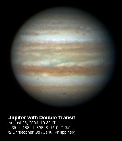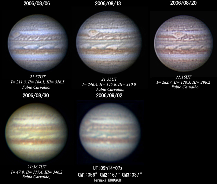 2005年12月に発生したmid-SEB outbreakの活動は、8月初めにはII=200°から大赤斑後方までの80度の範囲でしたが、次第に後端部が前進するとともに、新たな明るい白斑の出現もなくなり、8月末にはII=150°から前方の30度という狭い範囲となりました(画像2)。特に8月20日を過ぎると急速に白斑の出現がなくなりました。大赤斑の後方には定常的な大赤斑後方擾乱領域が知られていますが、mid-SEB outbreakが後方から迫ったために5月には消失しました。ところが、8月の大赤斑後方の様子を見ると、outbreakの白斑というよりも、大赤斑後方擾乱領域の活動と見えます。いつからoutbreakが終了したのか分かりませんが、少なくとも8月末には定常的な大赤斑後方擾乱領域の活動に戻ったものと考えられます。