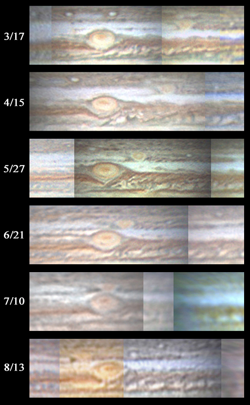 画像3に、小赤斑が大赤斑に後方から接近し、さらに大赤斑を追い越すまでを約1か月ごとにまとめました。7月13日には、小赤斑は大赤斑の真南を通過しました。この際にはハワイ・マウナケア山頂の8.1mジェミニ望遠鏡での観測も行われました。