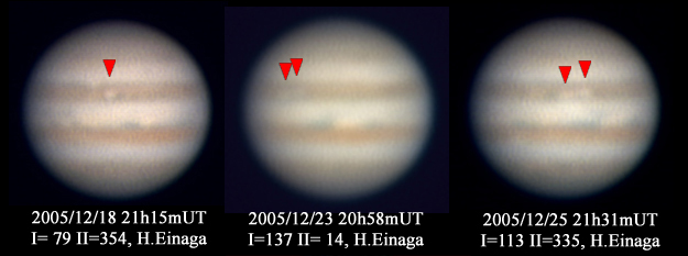 SEB(南赤道縞)は木星面で最も目立つベルトです。観測シーズンが始まってまもなくの2005年12月18日UTに、永長英夫氏(兵庫県)はII=350°のSEB中央に1個の明るい白斑の出現を発見しました(画像1)。永長氏の精力的な追跡観測によって、12月23日および25日には白斑が2個に分離し、前方の白斑は北寄りで、さらにその前方に青黒い暗部が見つかりました。これはmid-SEB outbreak(SEB中央の白斑突発現象)の典型的な発生初期のパターンでした。