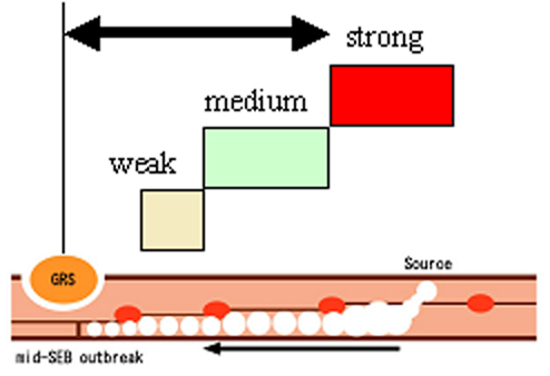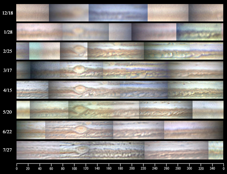 mid-SEB outbreakは、SEB南部の1つの発生源から次々と白斑が発生し、SEB北部を白斑が急速に前進し、SEBを白斑群で埋め尽くす現象です(画像2)。白斑と白斑の間は、青黒い暗部で区切られた独特のパターンを見ることができます。また、発生源と大赤斑との距離がoutbreakの規模と相関を持つことが知られています。大赤斑の後方100°以内で発生する小規模なoutbreakは、近年では2001年1月、2001年12月、2002年12月、2003年9月と毎年のように発生しています。大赤斑の後方200°を超えて発生する大規模なoutbreakは、1966年11月、1986年12月、1998年3月の3回しか起こっていません。今回のoutbreakは、大赤斑の後方242°で発生し、大規模な活動が予想されました。