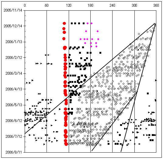 画像3はほぼ1ヵ月毎のoutbreakの発達の様子を展開図で示し、画像4はSEBに見られた白斑のドリフトチャートを示します。12月に発生したoutbreakの白斑の前端部は、急速に前進を続け、2006年3月末には大赤斑後方擾乱領域の後方に達しました。両者の白斑は交じり合うように前進し、5月中旬にはoutbreakの白斑のみが残りました。このとき、後方から押し出された大赤斑後方擾乱領域の白斑は、大赤斑の前方に噴き出して、SEB北部の白斑として観測されました。過去の観測では、outbreakの白斑と大赤斑後方擾乱領域の白斑は決して交じり合わないものだっただけに、今回のこの現象には驚きました。