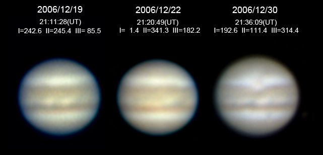 さらに、2006年9月にも、WSZはもっと前方にあった白斑に追いつき、時計方向に相互に回転しながら、9月13日に1個の白斑にマージする様子が観測されました(画像4)。同様にWSZが前進を続けるとしたら、図5に示すように、2月末(c)と3月末(d)に、再びNEBの白斑をマージする様子を観測できるかもしれません。