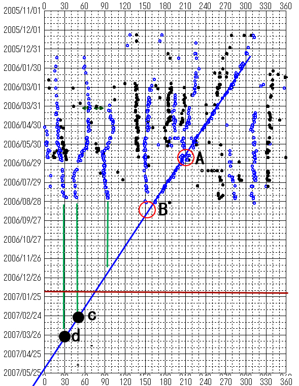 画像5 NEB北縁の白斑のドリフトチャート ○印がNEB北縁の白斑、●印がNEB中央のバージ(拡大) |