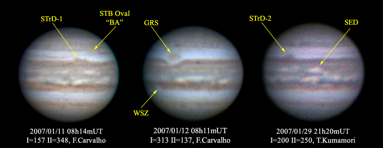 画像1 2007年1月の木星面 撮影/F.Carvalho(ブラジル、18cm反射)、を(堺市、20cm反射)(拡大) |