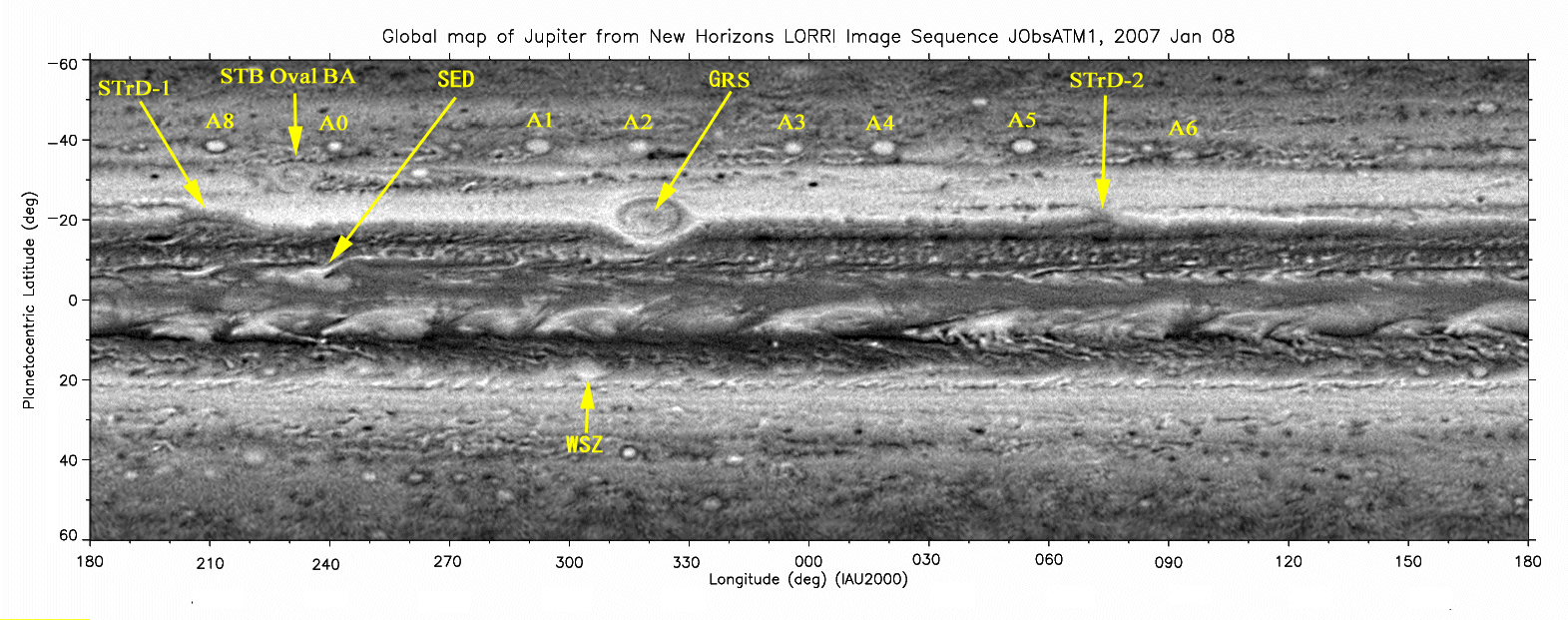 SSTB(南南温帯縞)には8個の小白斑が見られ、BAAが提案しているA0からA8のラベルを画像2に示します。また、NEB(北赤道縞)北縁にある長寿命な白斑WSZは、大赤斑の前方の経度に位置しています。昨シーズン、同じ緯度にあった2つの他の白斑を次々と合体した後、現在はその前進速度が鈍り、ほぼ停滞しています。