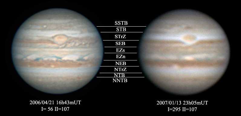 さらに、大赤斑後方のSEBの白斑が全く見られないことも大きな特徴です(画像1中)。同時に、SEBsジェット気流に乗った後退暗斑が見られず、そのために大赤斑(GRS)を取り巻く暗部がないむき出しの状態が見られます。つまり、SEB全体の活動が非常におとなしくなっていると言えます。BAAのJ.Rogers氏からの情報では、「このような全ての活動が停止した最後の年は1988年であった。その時は、1989年にSEBは淡化(白化)し、1990年に劇的なSEB復活(SEB Revival)が発生した。すなわち、2007年のどこかで、後に劇的なSEB復活につながるSEBの淡化を見ることができるかもしれない。」と考えられますので、これからの観測が楽しみになってきました。