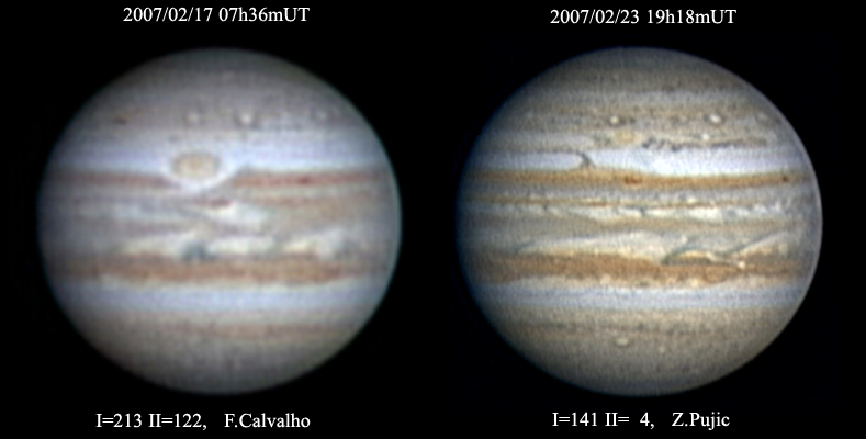 画像1 2007年2月の木星面 撮影/F.Carvalho(ブラジル、25cm反射)、Z.Pujicを(オーストラリア、31cm反射)(拡大) |